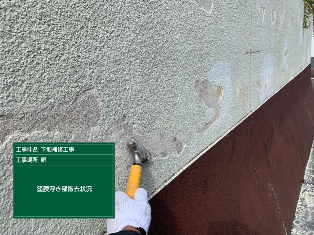 塀の塗膜の膨れが酷いのでしっかりと補修していきます。