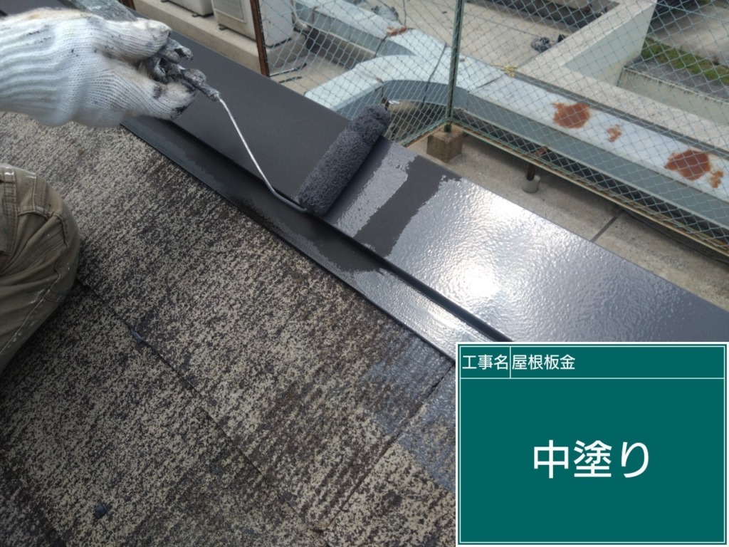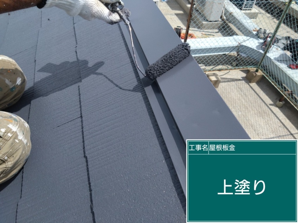 屋根板金上塗り(ファインシリコンフレッシュⅡ2回塗り)を塗っていきます。