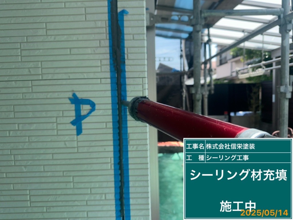 プライマーを塗布後、コーキングガンを使い目地部分にシーリング材を充填していきます。