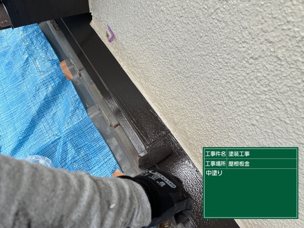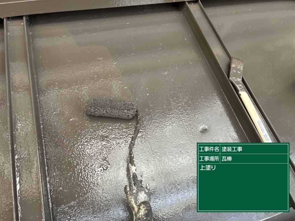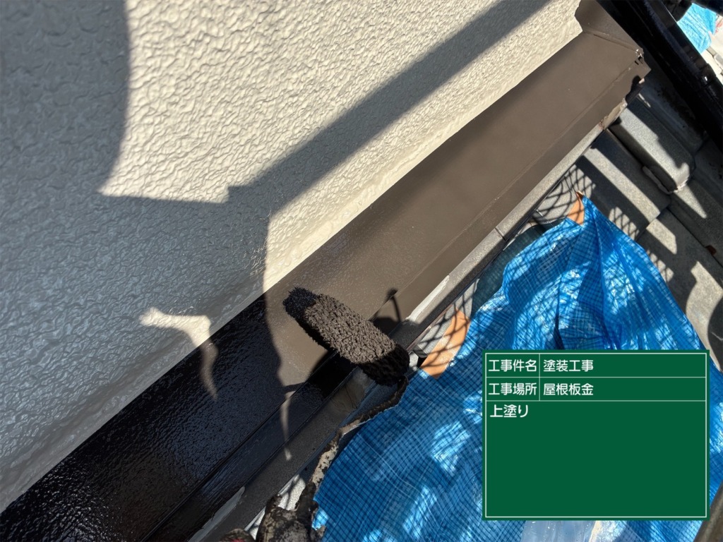 屋根板金塗装(ファインシリコンフレッシュⅡ2回塗り)を塗っていきます。