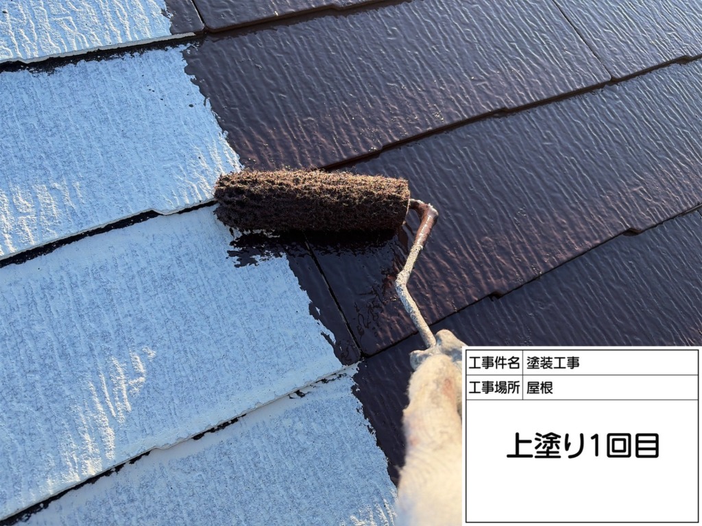 屋根塗装上塗り(グランセラベストファイン遮熱2回塗り)を塗っていきます。