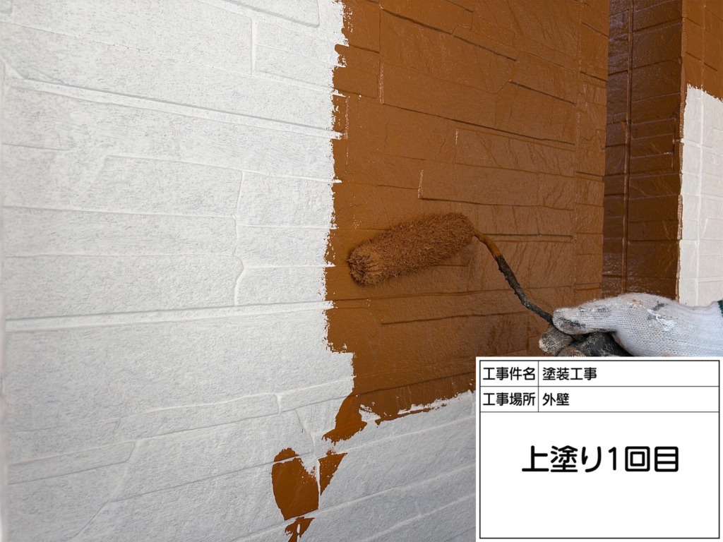 外壁塗装上塗り(グランセラトップ2液水性2回塗り)を塗っていきます。