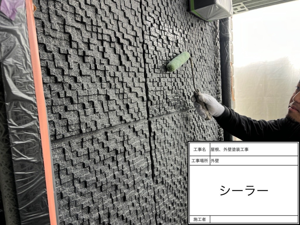 外壁塗装下塗り(クリスタルアート)を塗っていきます。